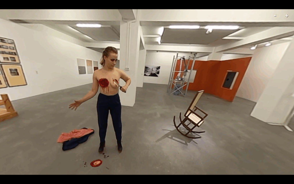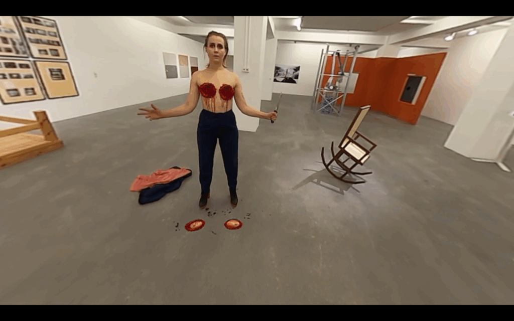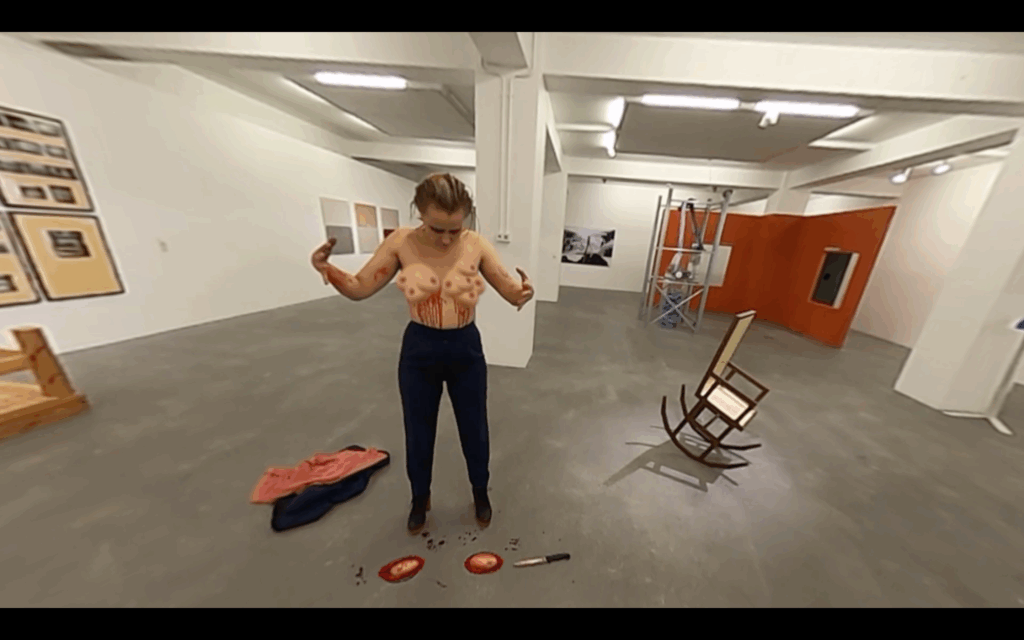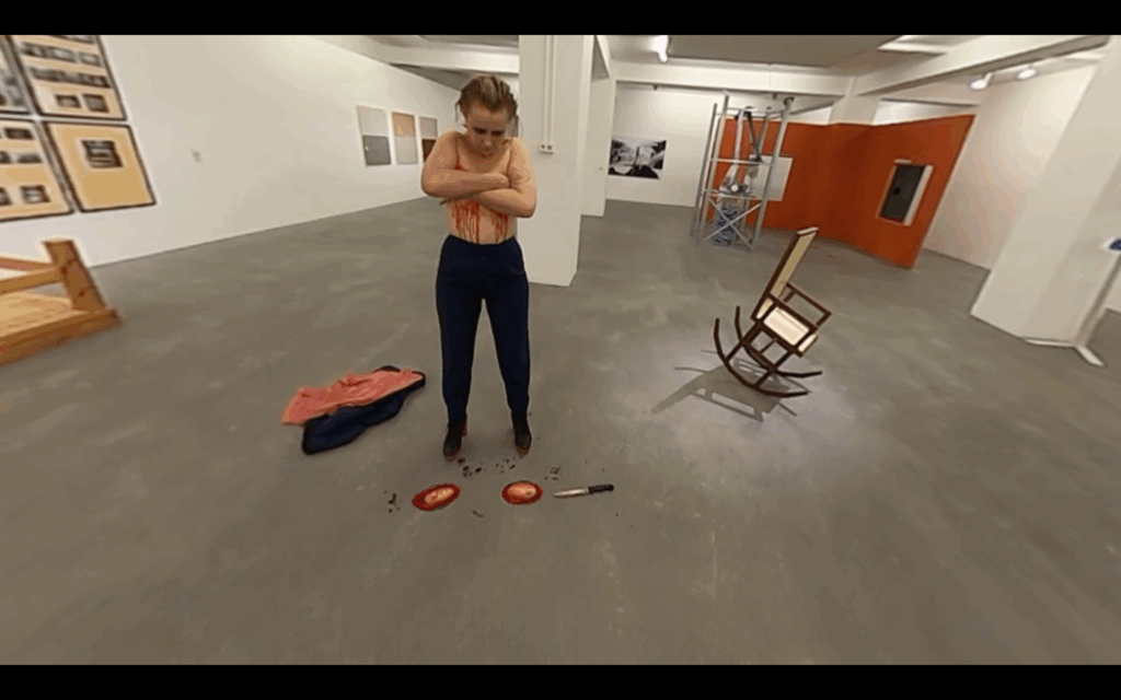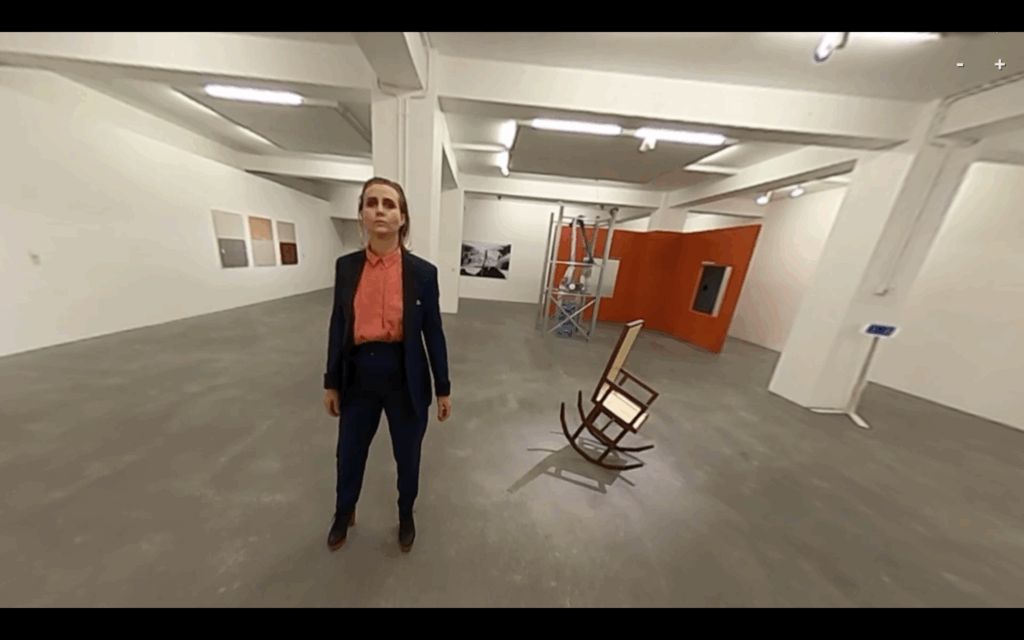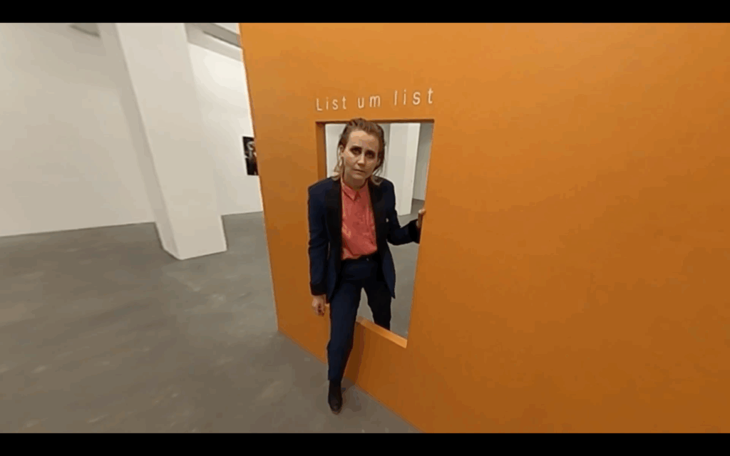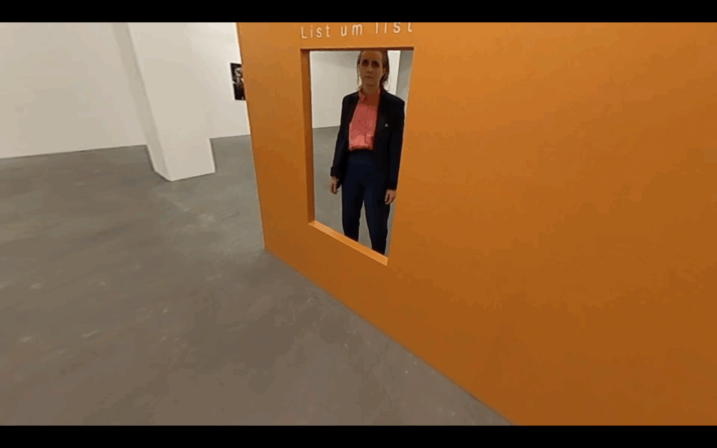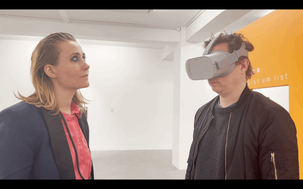 The viewer experiences the VR work within the same physical space in which the video is presented, creating a dual perception of space. In this merging of realities, the viewer becomes a living sculpture within the exhibition.